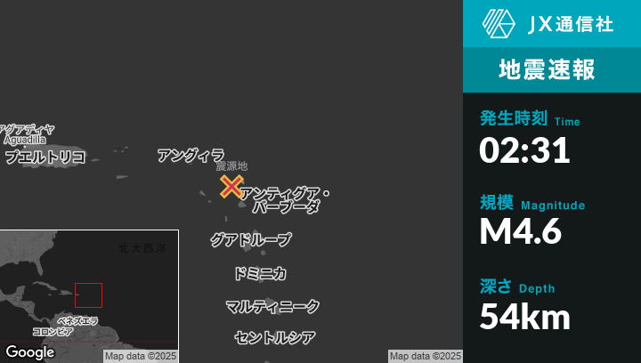 4月19日 02:31頃、アンティグア・バーブーダのCodringtonから西23kmの地点でM4.6の地震がありました。