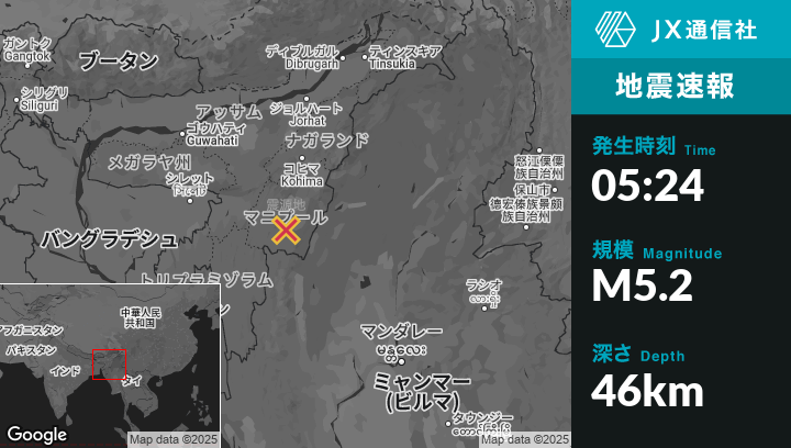 5月28日 05:24頃、インドのMoirāngから南南東0kmの地点でM5.2の地震がありました。