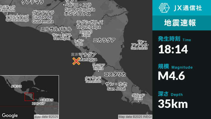 5月28日 18:14頃、ニカラグアのMasachapaから西南西71kmの地点でM4.6の地震がありました。