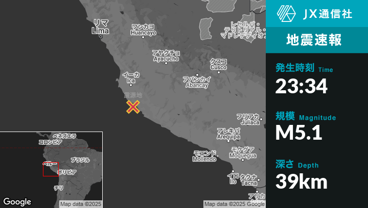 5月28日 23:34頃、ペルーのChanguilloから西南西51kmの地点でM5.1の地震がありました。