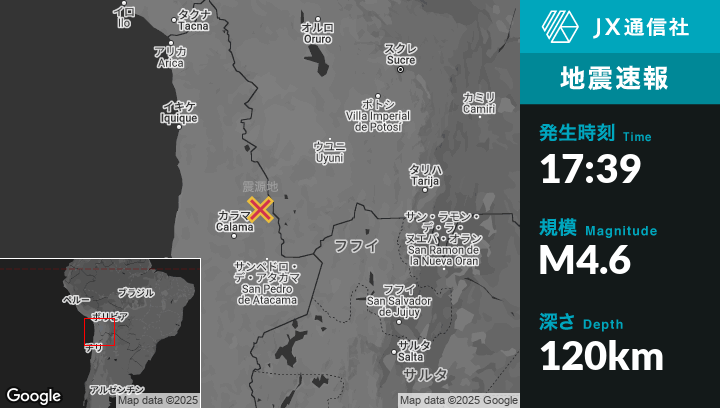 5月29日 17:39頃、チリのOllagüeから南64kmの地点でM4.6の地震がありました。