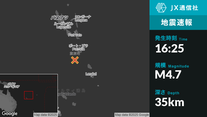 | 震源地 | バヌアツのPort-Vilaから南南西62kmの地点 |