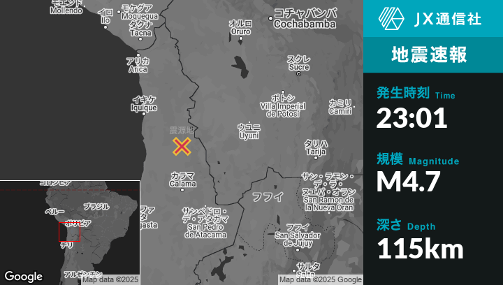 6月07日 23:01頃、チリのOllagüeから西北西74kmの地点でM4.7の地震がありました。