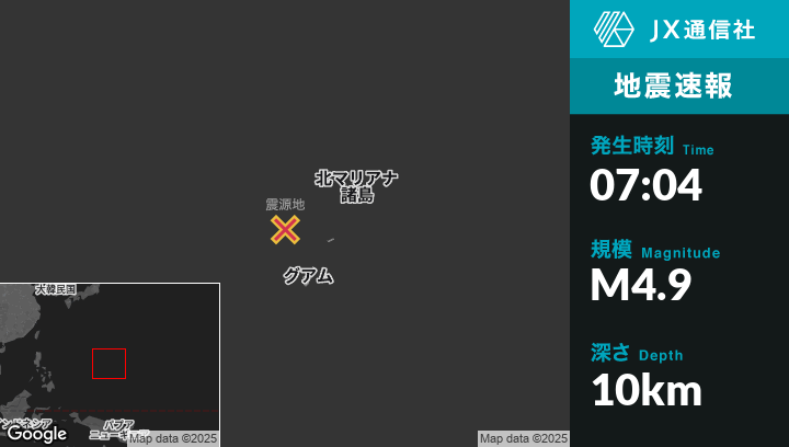 6月08日 07:04頃、グアムのAsan-Maina Villageから北北西120kmの地点でM4.9の地震がありました。
