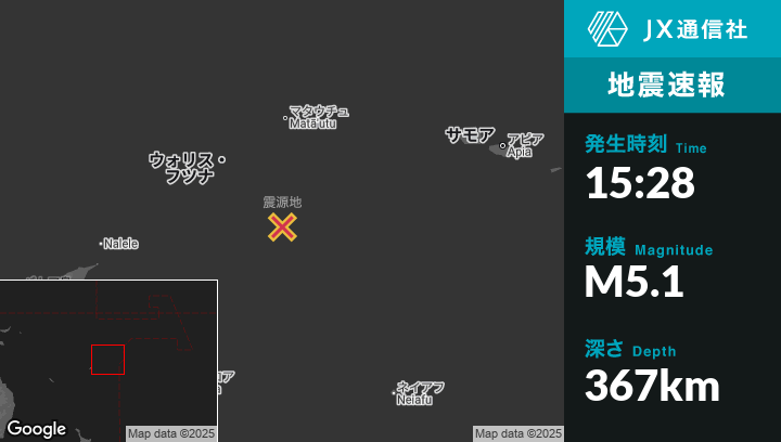6月13日 15:28頃、ウォリス・フツナのMata-Utuから南223kmの地点でM5.1の地震がありました。