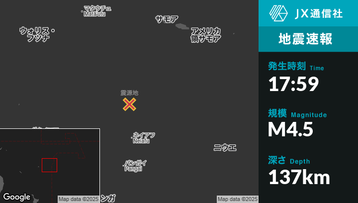 6月13日 17:59頃、トンガのHihifoから南南西132kmの地点でM4.5の地震がありました。