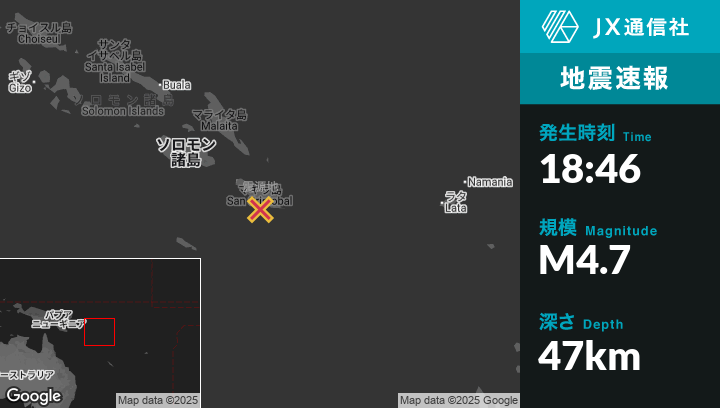 6月15日 18:46頃、ソロモン諸島のKirakiraから南南西33kmの地点でM4.7の地震がありました。