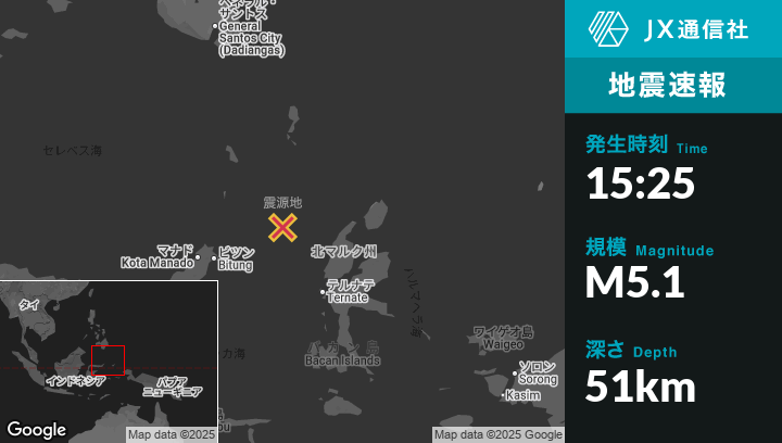 | 震源地 | インドネシアのTobeloから西北西168kmの地点 |
