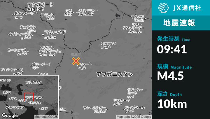 6月20日 09:41頃、アフガニスタンのQarah Bāghから南東33kmの地点でM4.5の地震がありました。