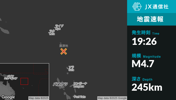 | 震源地 | バヌアツのSolaから北北西185kmの地点 |