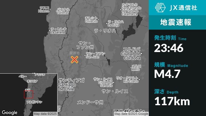 | 震源地 | アルゼンチンのCalingastaから南42kmの地点 |