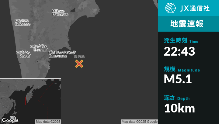 | 震源地 | ロシアのPetropavlovsk-Kamchatskyから東南東146kmの地点 |