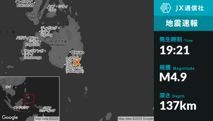 7月23日 19:21頃、フィリピンのTiblawanから南3kmの地点でM4.9の地震がありました。