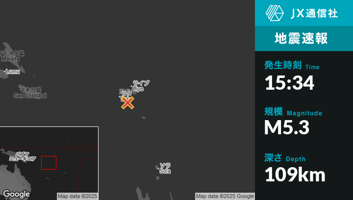 7月24日 15:34頃、ソロモン諸島のLataから東南東43kmの地点でM5.3の地震がありました。
