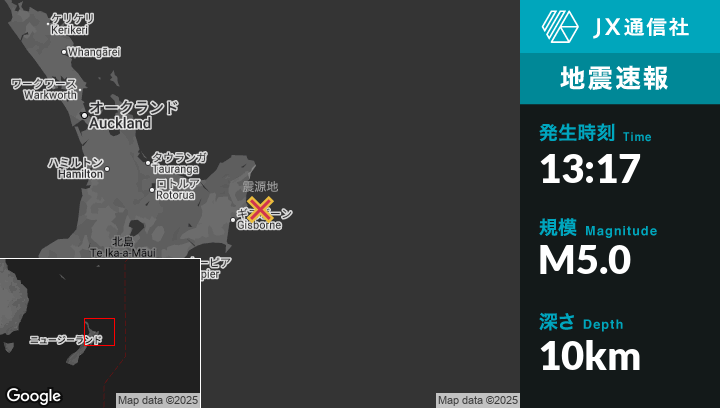 7月25日 13:17頃、ニュージーランドのWainuiから北東57kmの地点でM5.0の地震がありました。