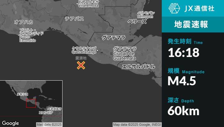 7月29日 16:18頃、グアテマラのOcósから南西81kmの地点でM4.5の地震がありました。