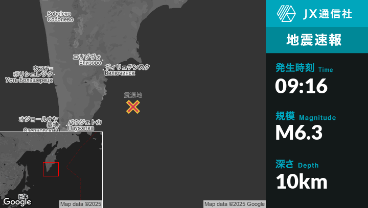 7月30日 09:16頃、ロシアのVilyuchinskから南東131kmの地点でM6.3の地震がありました。