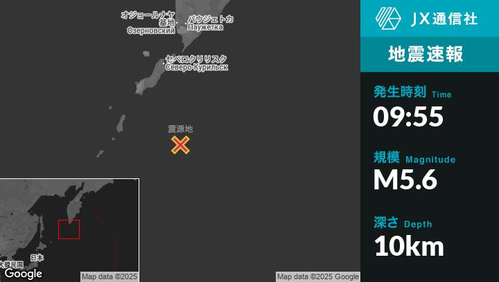7月30日 09:55頃、ロシアのSevero-Kuril’skから南南東181kmの地点でM5.6の地震がありました。