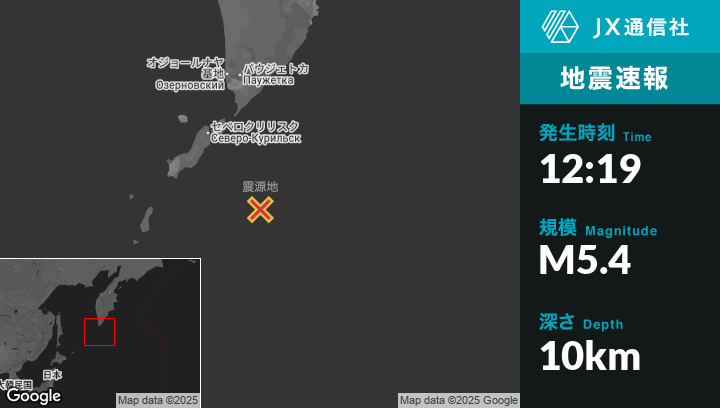 7月30日 12:19頃、ロシアのSevero-Kuril’skから南東138kmの地点でM5.4の地震がありました。