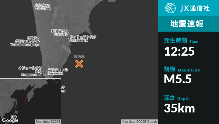 7月30日 12:25頃、ロシアのVilyuchinskから南南東124kmの地点でM5.5の地震がありました。