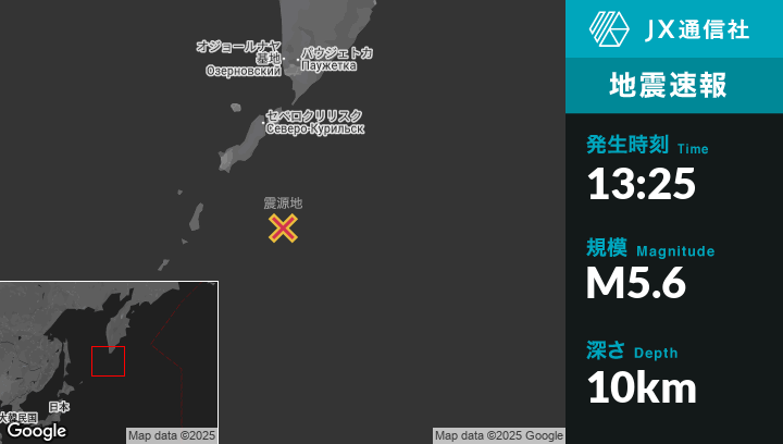 7月30日 13:25頃、ロシアのSevero-Kuril’skから南146kmの地点でM5.6の地震がありました。