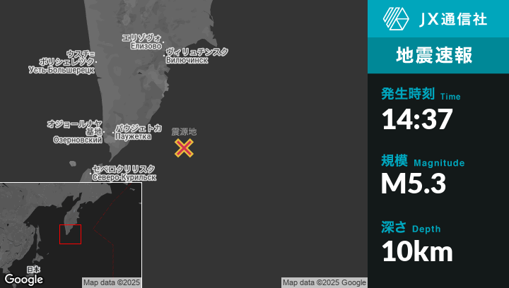 | 震源地 | ロシアのOzernovskiyから東176kmの地点 |