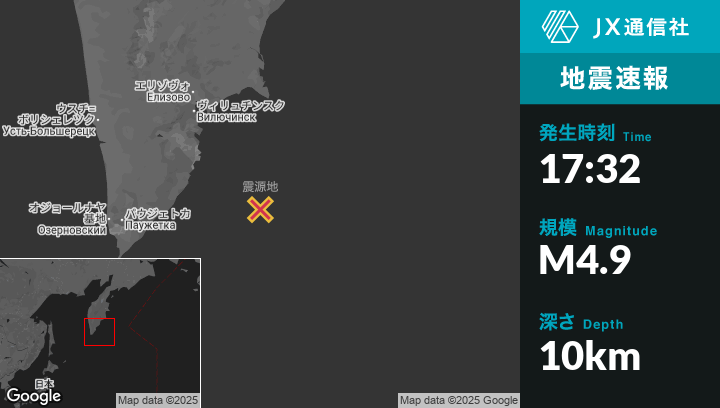 7月30日 17:32頃、ロシアのVilyuchinskから南東170kmの地点でM4.9の地震がありました。