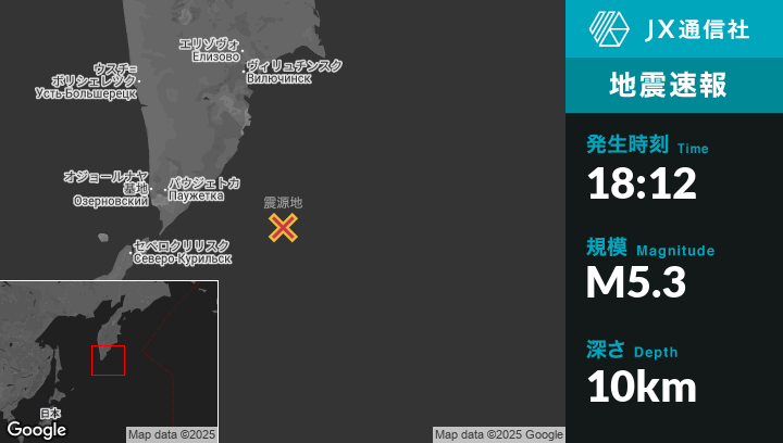 | 震源地 | ロシアのOzernovskiyから東南東194kmの地点 |