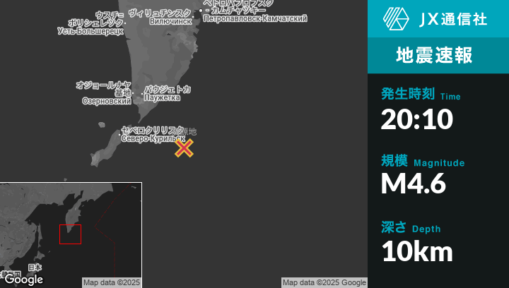 7月30日 20:10頃、ロシアのSevero-Kuril’skから東142kmの地点でM4.6の地震がありました。