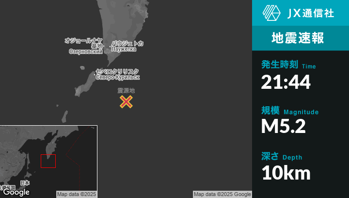 7月30日 21:44頃、ロシアのSevero-Kuril’skから南東128kmの地点でM5.2の地震がありました。