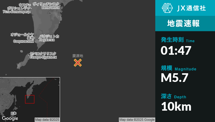 7月31日 01:47頃、ロシアのSevero-Kuril’skから東254kmの地点でM5.7の地震がありました。