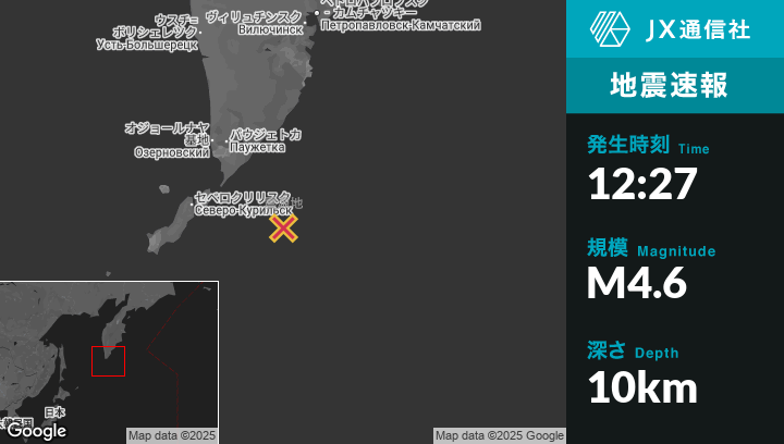 7月31日 12:27頃、ロシアのSevero-Kuril’skから東南東132kmの地点でM4.6の地震がありました。