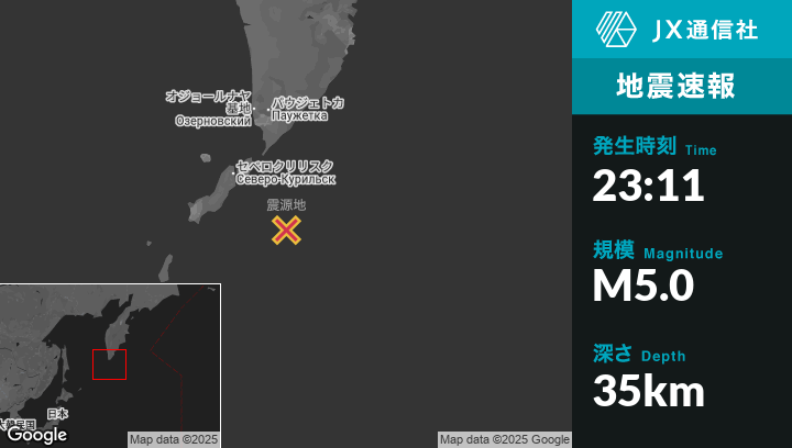 | 震源地 | ロシアのSevero-Kuril’skから南東104kmの地点 |