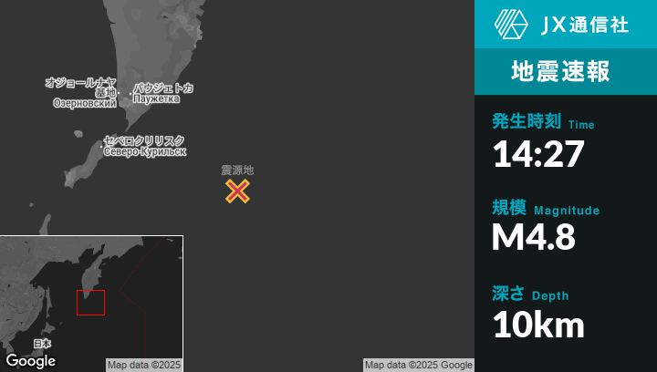 | 震源地 | ロシアのSevero-Kuril’skから東南東242kmの地点 |