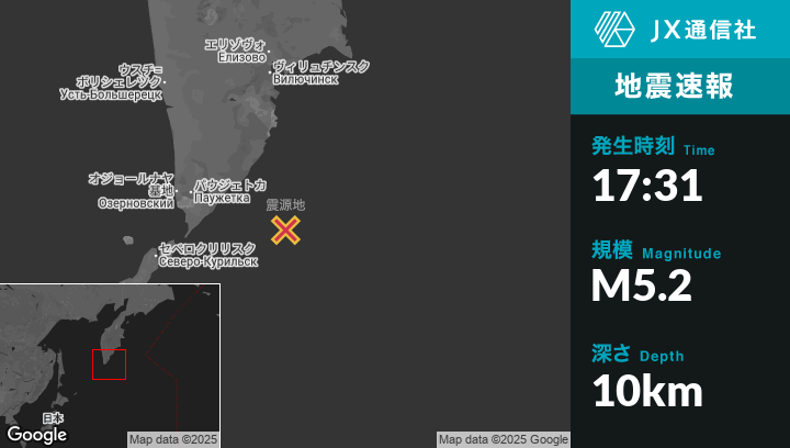 | 震源地 | ロシアのOzernovskiyから東南東161kmの地点 |