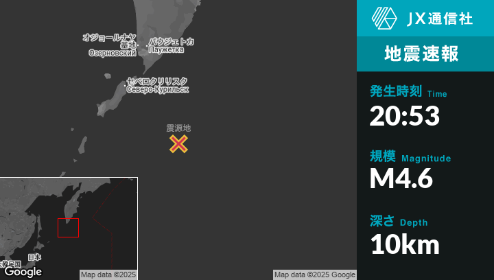 | 震源地 | ロシアのSevero-Kuril’skから南東174kmの地点 |