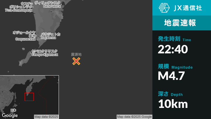 | 震源地 | ロシアのSevero-Kuril’skから東242kmの地点 |
