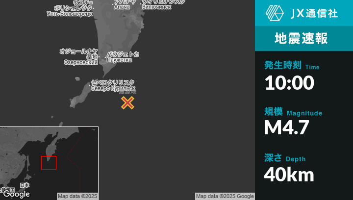 8月02日 10:00頃、ロシアのSevero-Kuril’skから東南東127kmの地点でM4.7の地震がありました。