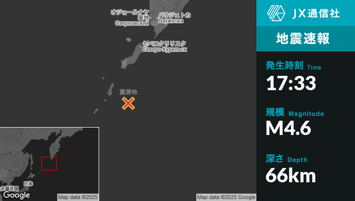| 震源地 | ロシアのSevero-Kuril’skから南南西177kmの地点 |