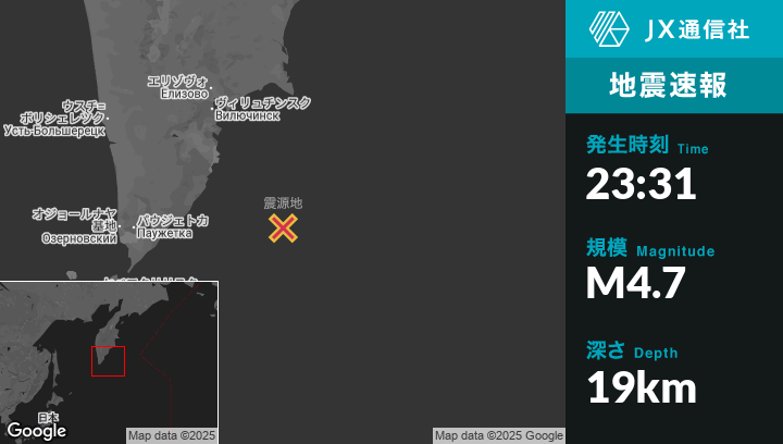 8月02日 23:31頃、ロシアのVilyuchinskから南南東183kmの地点でM4.7の地震がありました。