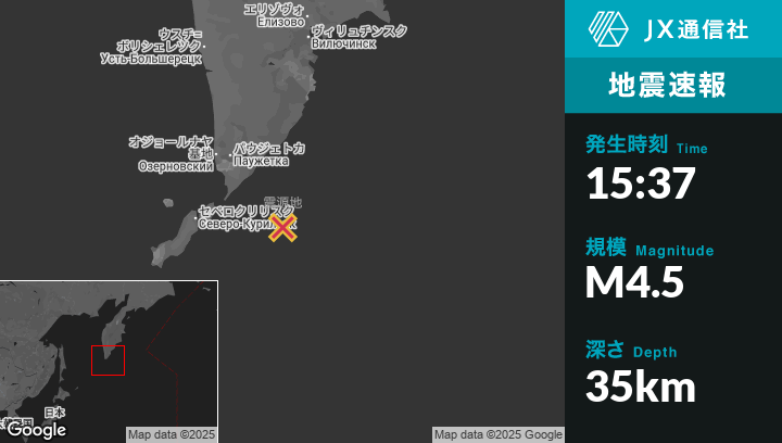 | 震源地 | ロシアのSevero-Kuril’skから東124kmの地点 |