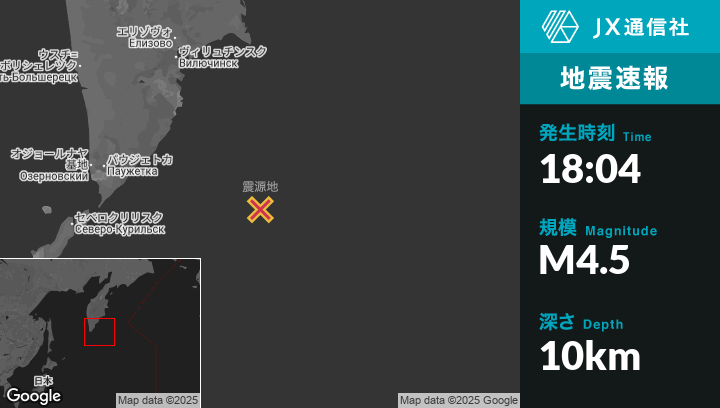 8月03日 18:04頃、ロシアのVilyuchinskから南南東254kmの地点でM4.5の地震がありました。