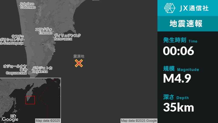 8月04日 00:06頃、ロシアのVilyuchinskから南東173kmの地点でM4.9の地震がありました。