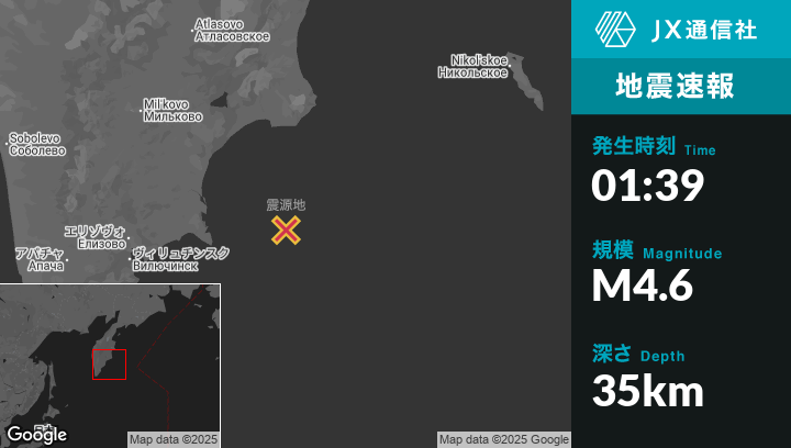 | 震源地 | ロシアのPetropavlovsk-Kamchatskyから東196kmの地点 |