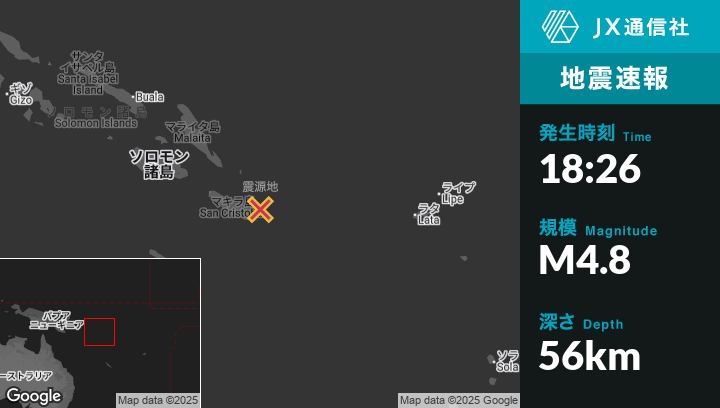 8月04日 18:26頃、ソロモン諸島のKirakiraから東51kmの地点でM4.8の地震がありました。