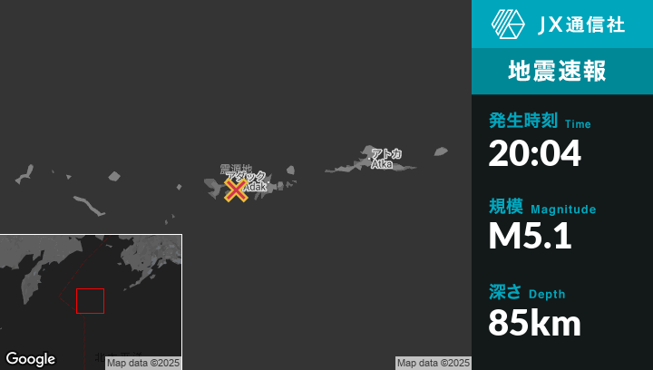8月05日 20:04頃、アラスカのAdakから西54kmの地点でM5.1の地震がありました。
