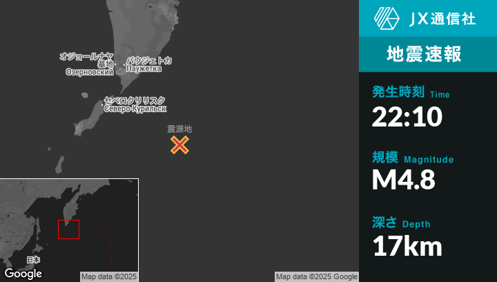8月08日 22:10頃、ロシアのSevero-Kuril’skから東南東192kmの地点でM4.8の地震がありました。