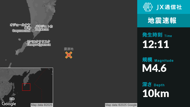 8月10日 12:11頃、ロシアのSevero-Kuril’skから東南東257kmの地点でM4.6の地震がありました。