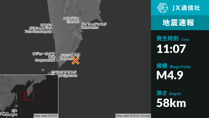 | 震源地 | ロシアのOzernovskiyから東107kmの地点 |