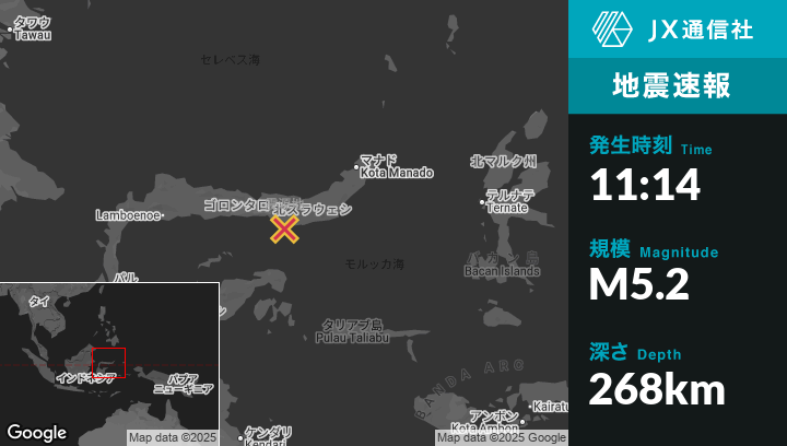 8月12日 11:14頃、インドネシアのGorontaloから東南東42kmの地点でM5.2の地震がありました。